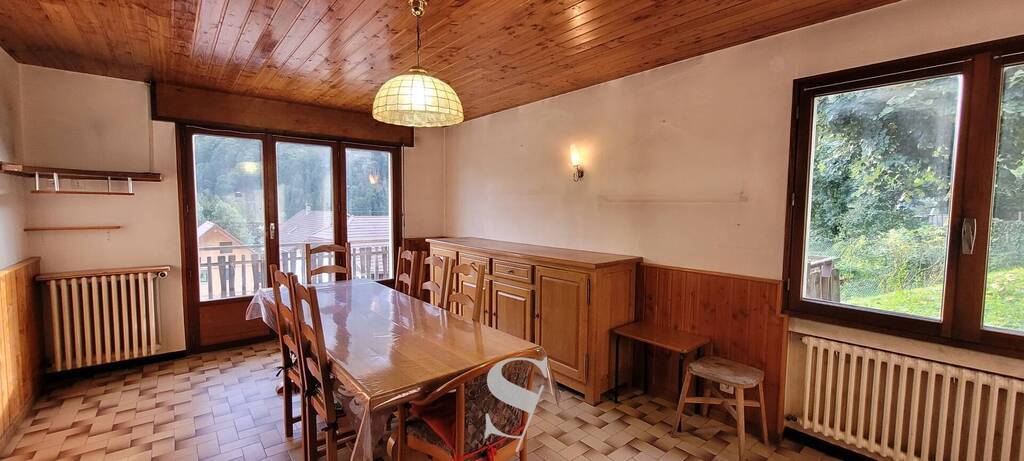 Située dans un petit hameau ensoleillé à seulement 3 km de Thônes, cette maison mitoyenne de 7 pièces, construite en 1972 offre un beau potentiel et de beaux volumes. Cuisine indépendante avec possibilité d'ouvrir sur le séjour afin d'optimiser un espace plus important, cheminée avec insert, chambre, salle d'eau et wc. Edifiée sur 2 niveaux avec ses 4 chambres, salle de bains et wc, elle developpe environ 149 m2 habitables, auxquels s'ajoutent des annexes utiles pour le rangement ou les futurs projets. Les combles aménageables permettent d'envisager un agrandissement ou la création d'un espace supplémentaire selon vos besoins. Au rez garage, stationnement, cave, grenier et terrain environ 2000 m2 NC.